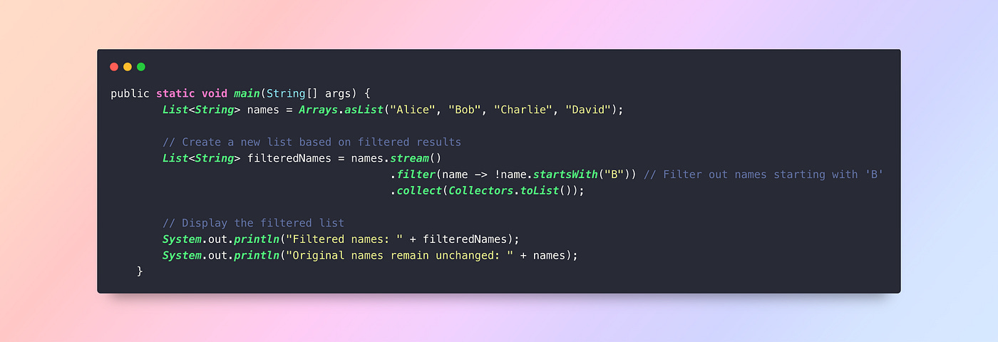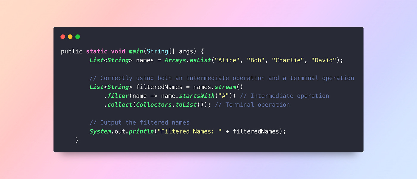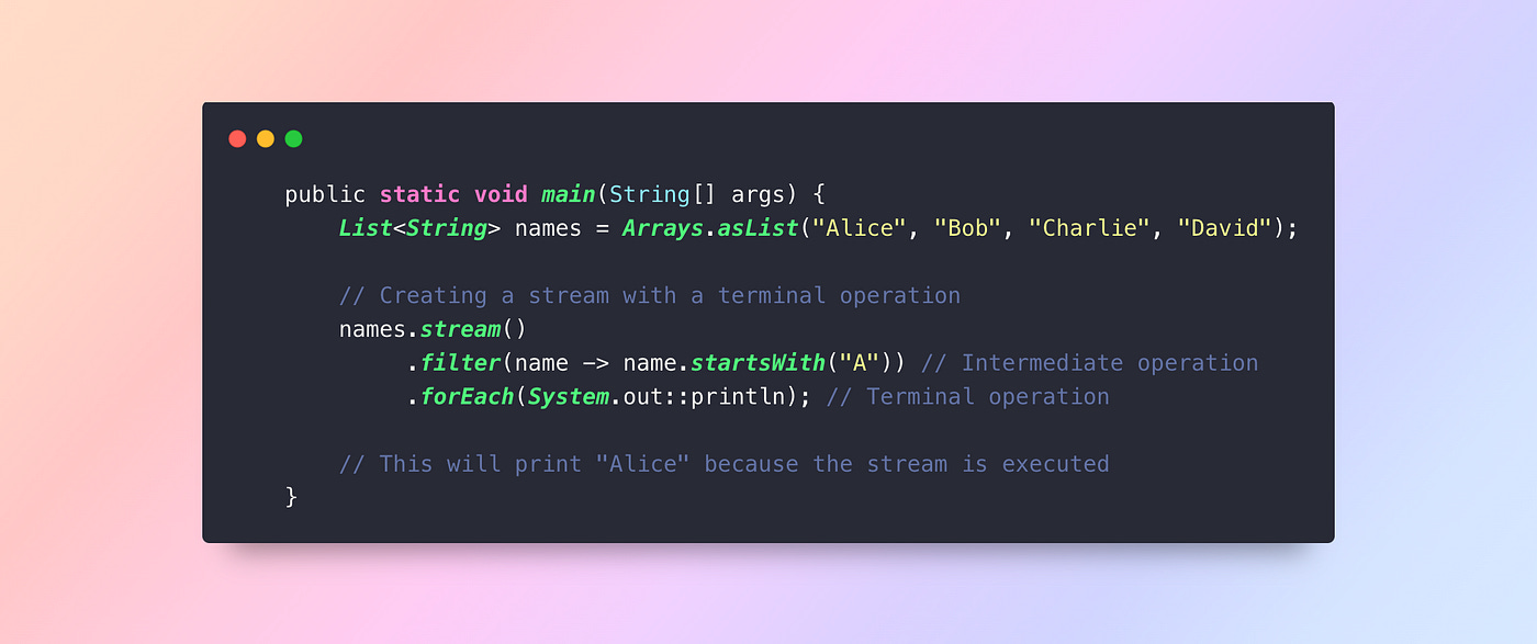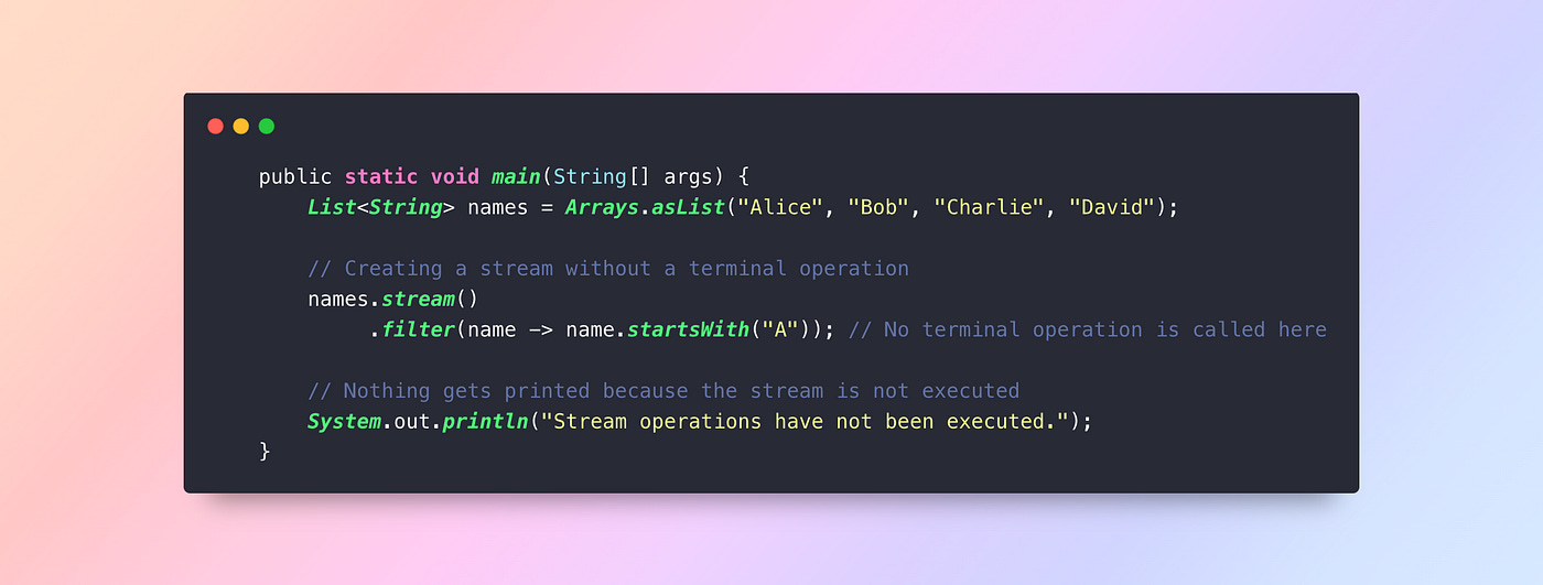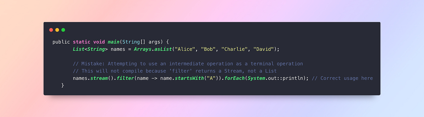 Mistake: Forgetting to call a terminal operation likecollect(),forEach(), orreduce(), this leads to no execution.