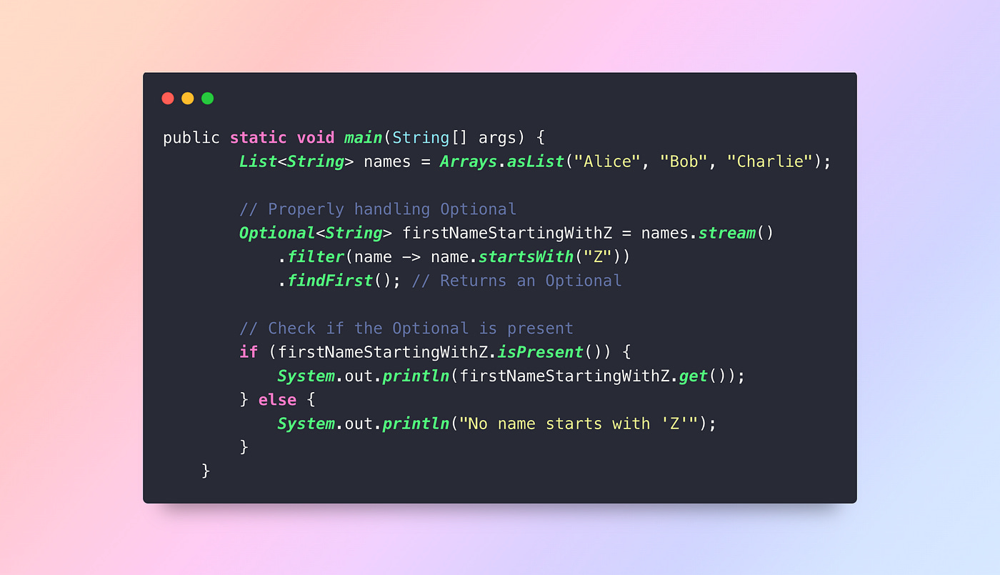 Mistake: Not handling Optional results properly when using operations like findFirst() or reduce().