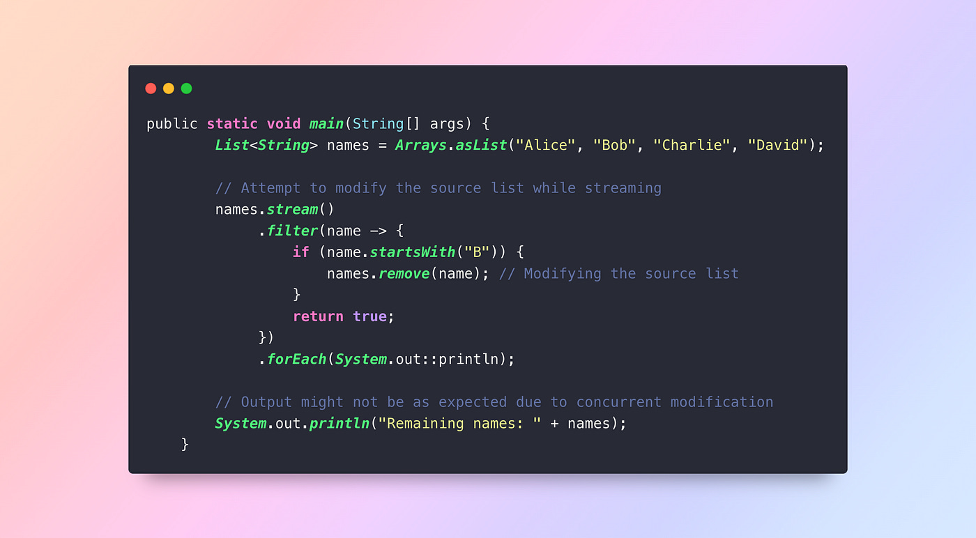 Mistake: Changing the data structure (like a List) while processing it in a stream can lead to unknown results.